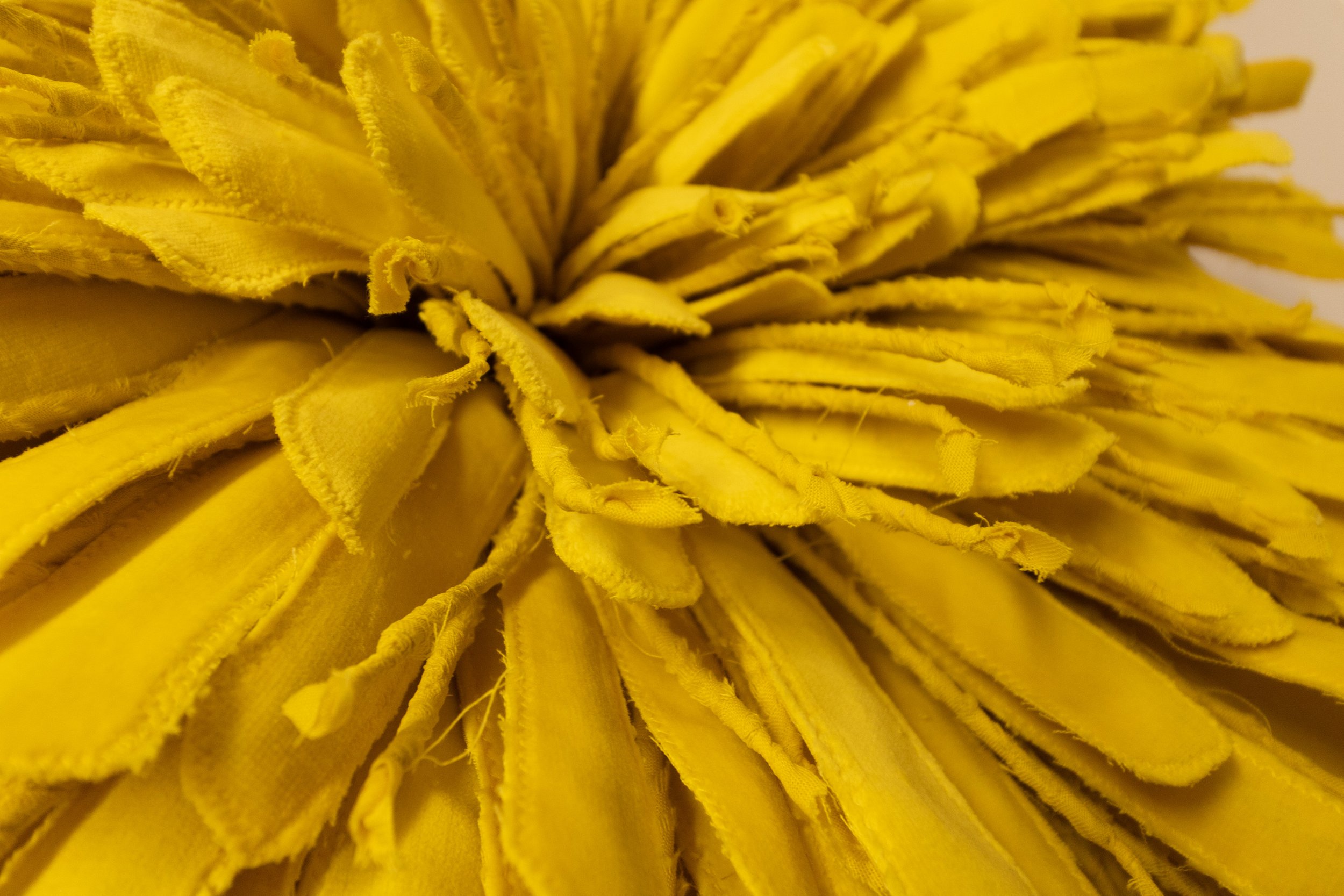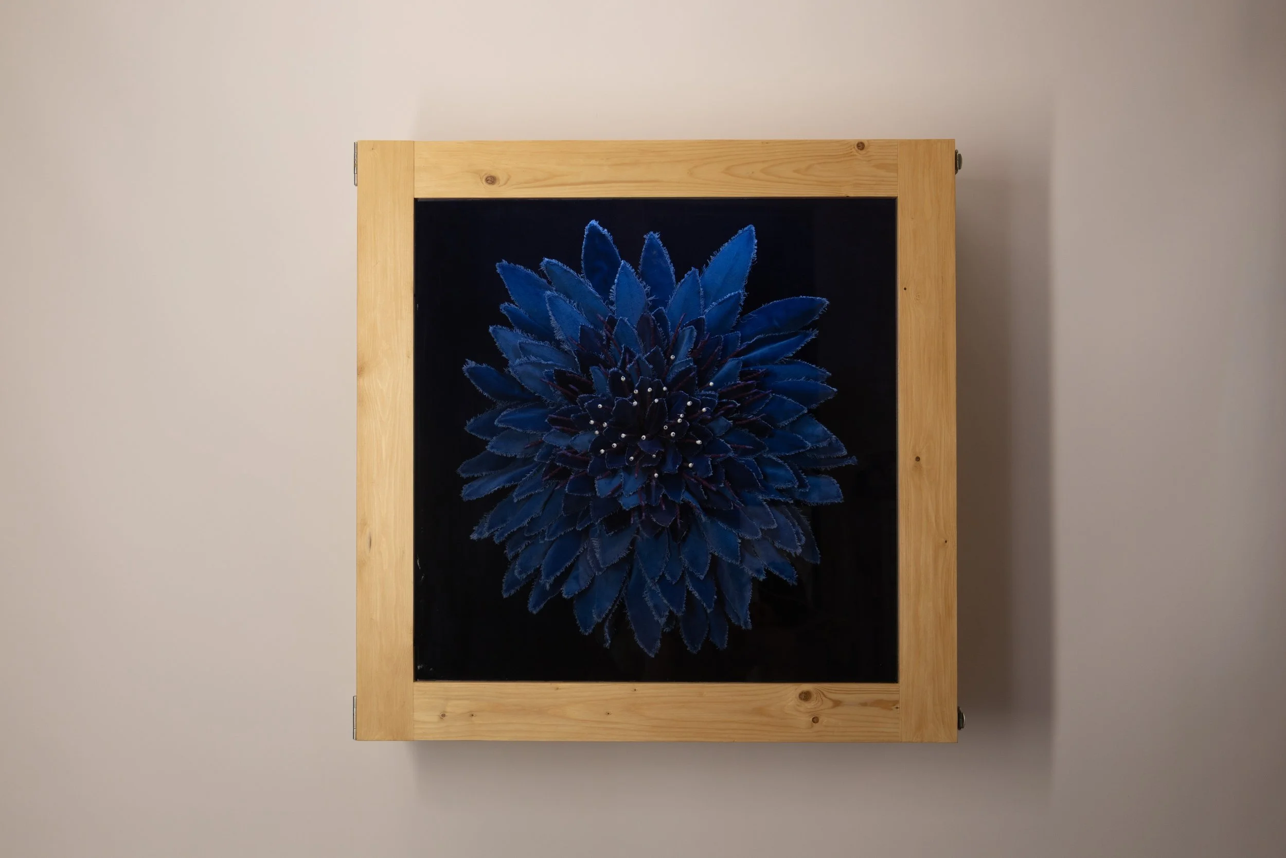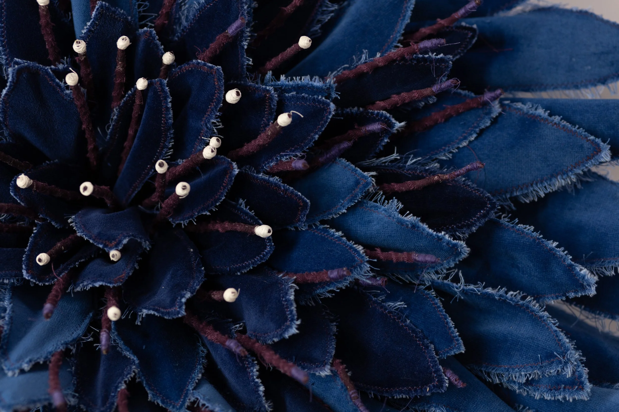 Het idee was een ontmoeting op ooghoogte, waarbij je als kijker recht in het hart van de levensgrootte bloem kunt kijken. Na een zoektocht langs diverse materialen kwam ik uiteindelijk uit bij textiel, het materiaal dat mijn liefde voor kunst en vormgeving ooit heeft doen ontkiemen. Om de bloemen als wandobjecten stevig en duurzaam te laten functioneren, bleek het echter noodzakelijk om een constructie toe te voegen ter versteviging, deze is onzichtbaar verwerkt. Het bijzondere is dat je zo in het hart van de bloem kunt kijken. Alle bloemen hebben een doorsnede van ongeveer 80 centimeter, wat zorgt voor een indrukwekkende en intieme beleving.