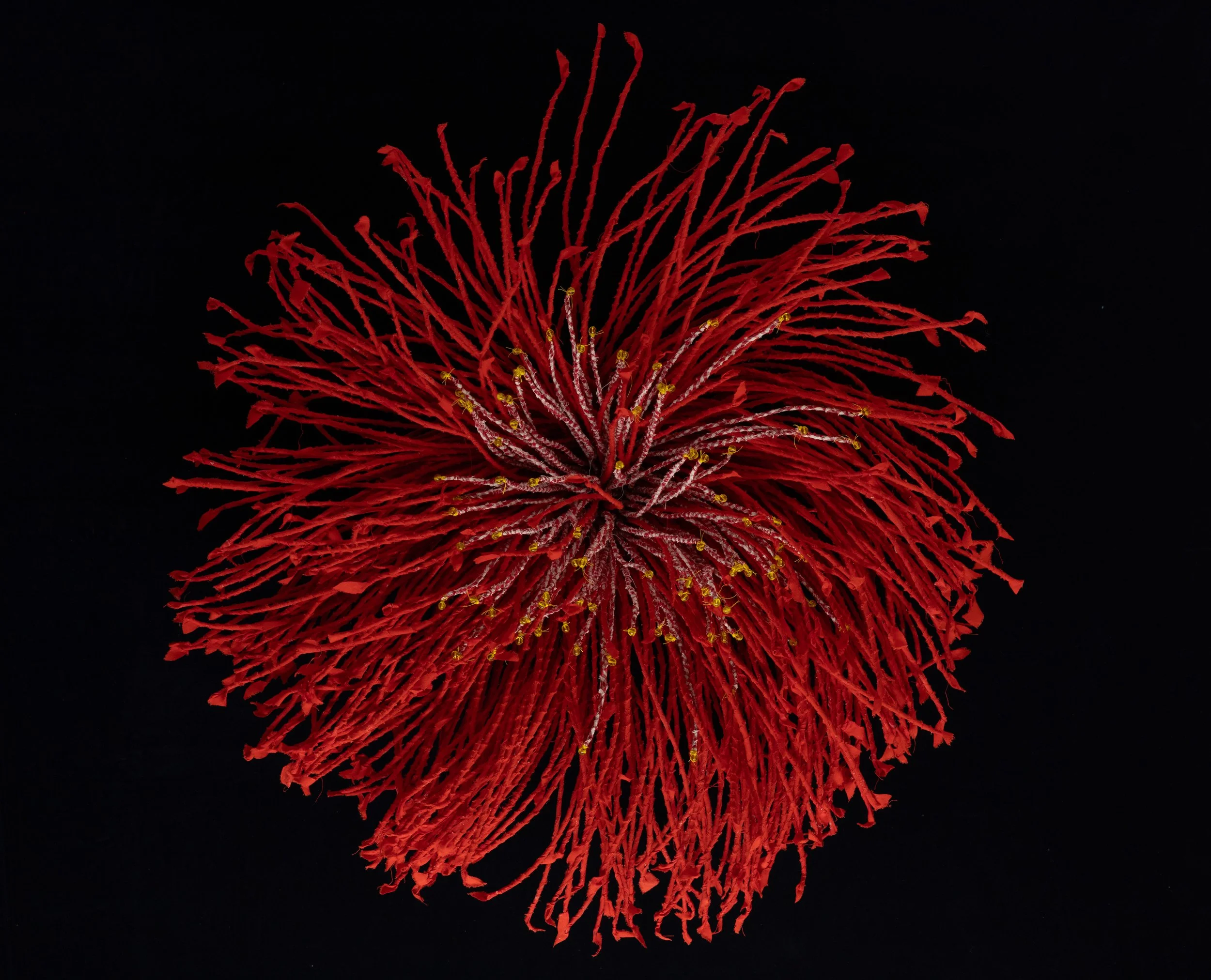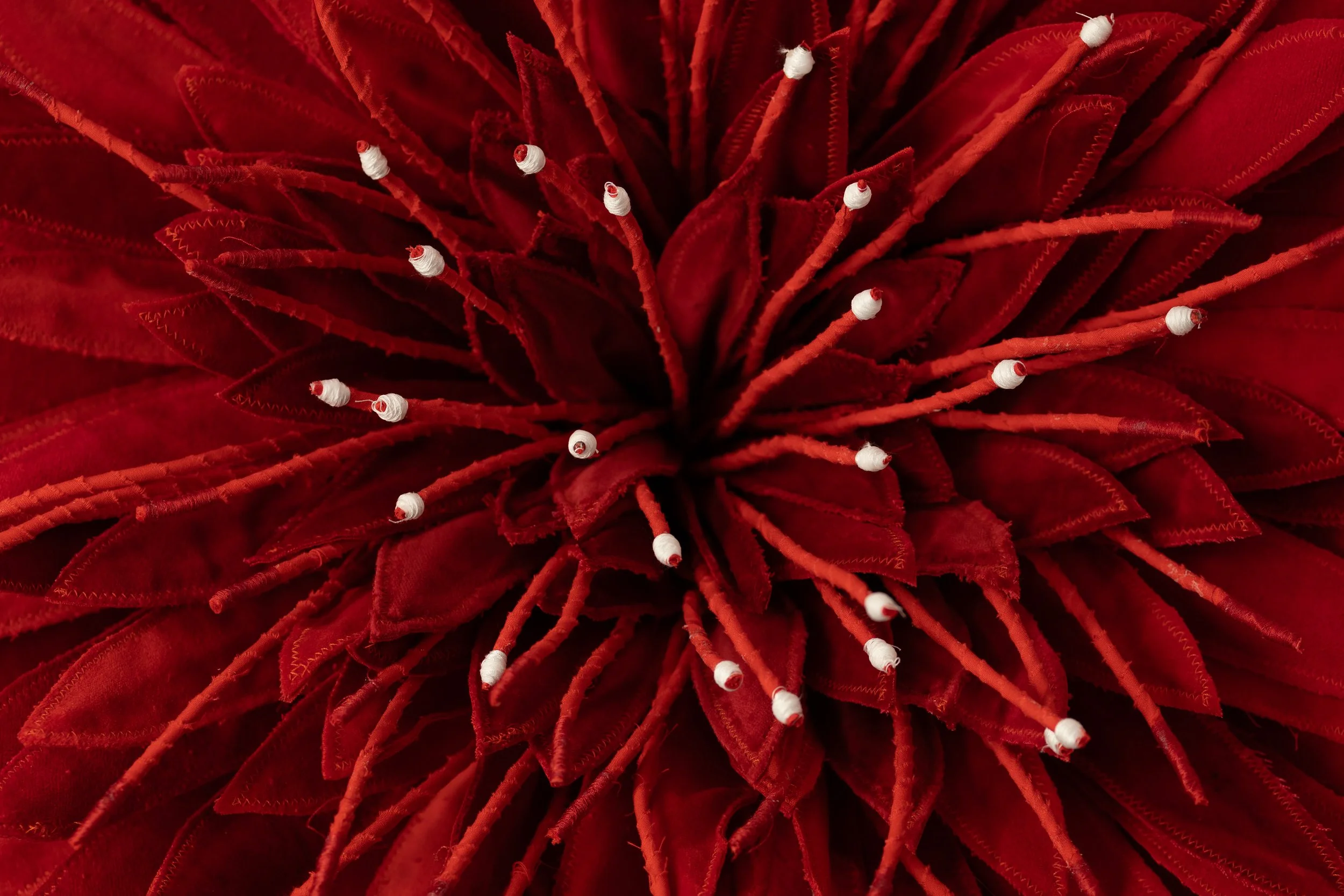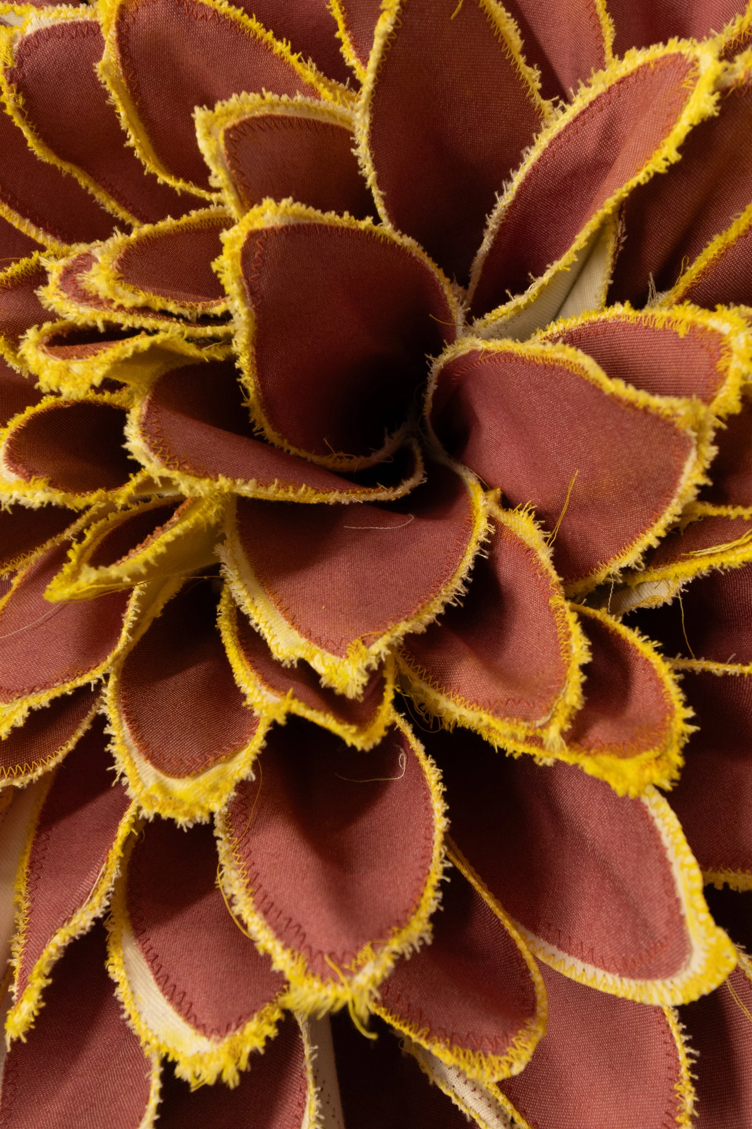 Het idee was een ontmoeting op ooghoogte, waarbij je als kijker recht in het hart van de levensgrootte bloem kunt kijken. Na een zoektocht langs diverse materialen kwam ik uiteindelijk uit bij textiel, het materiaal dat mijn liefde voor kunst en vormgeving ooit heeft doen ontkiemen. Om de bloemen als wandobjecten stevig en duurzaam te laten functioneren, bleek het echter noodzakelijk om een constructie toe te voegen ter versteviging, deze is onzichtbaar verwerkt. Het bijzondere is dat je zo in het hart van de bloem kunt kijken. Alle bloemen hebben een doorsnede van ongeveer 80 centimeter, wat zorgt voor een indrukwekkende en intieme beleving.